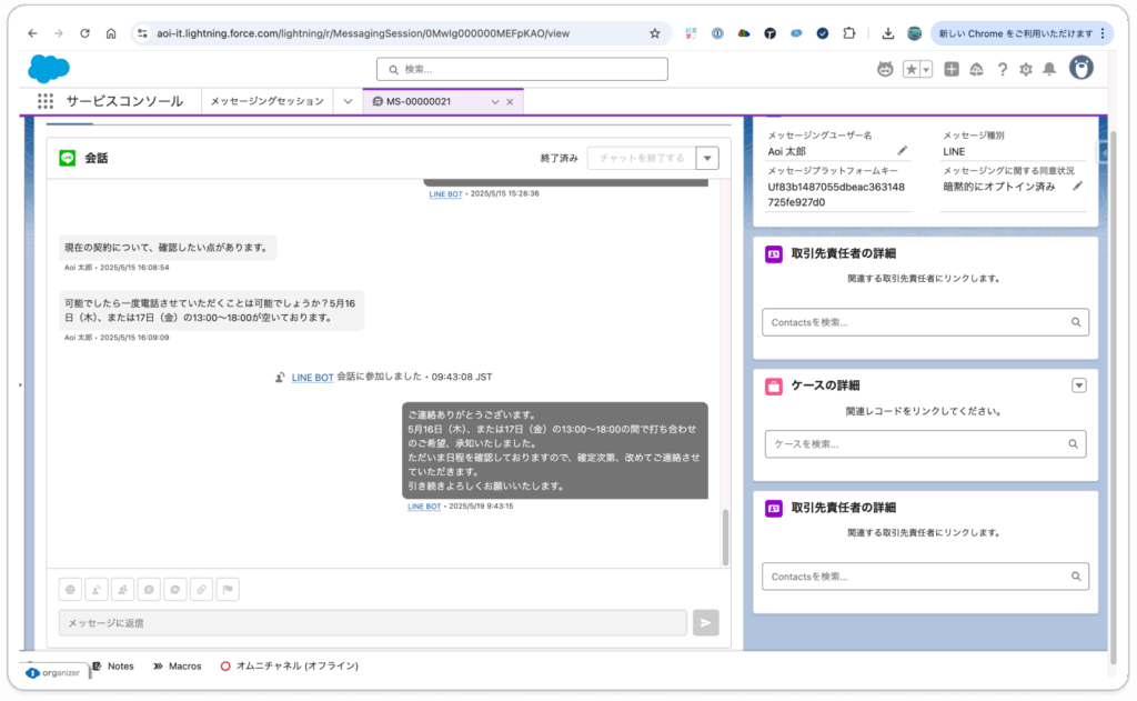 ですが、SalesforceのDigital Engagementによって、LINEでのやりとりをそのままSalesforceの画面の中でできるようになります。