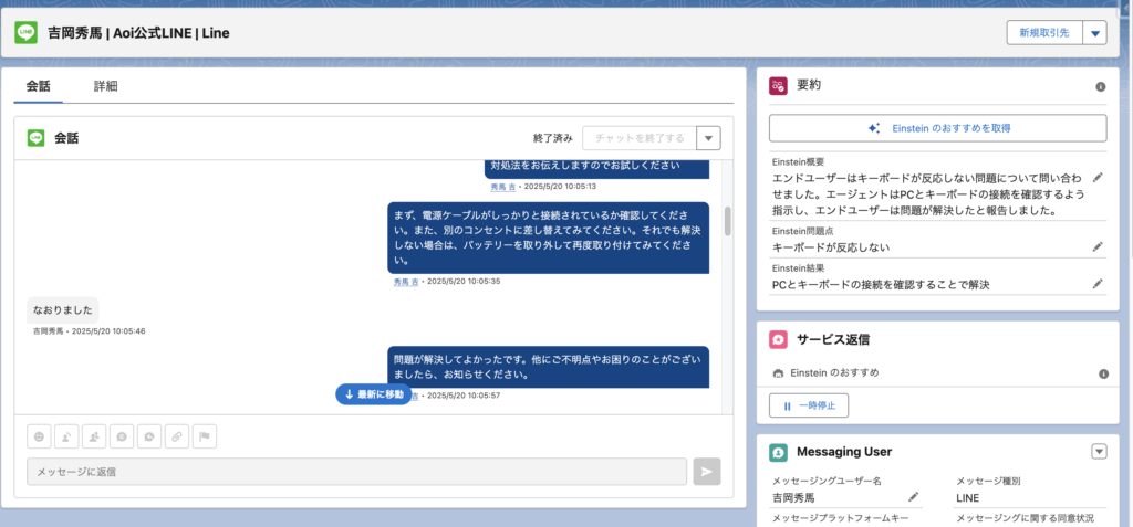 また、Salesforceと連携することで、LINEでのやりとり内容を取引先責任者やケースとして自動で記録・分析できるため、対応履歴の管理やマーケティングへの活用も可能です。Service Agentは、人的リソースに頼らず、効率的で質の高いコミュニケーション体制を構築する強力なパートナーとなります。